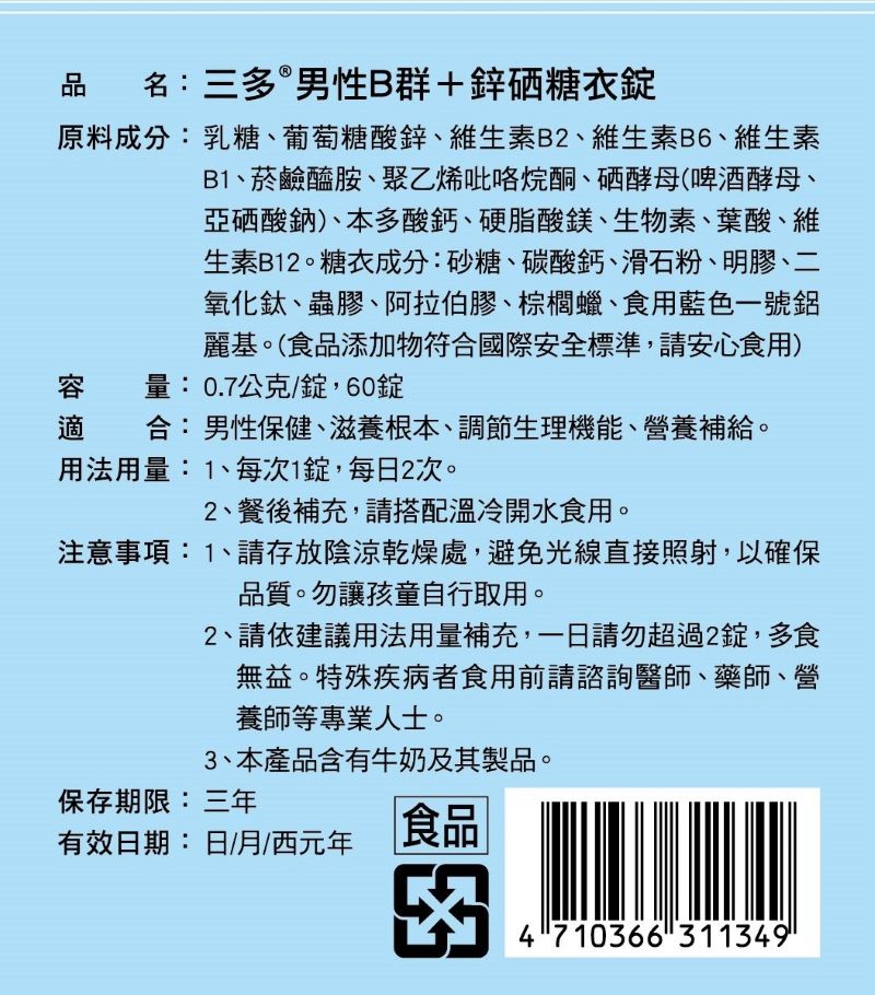 營養保健 成人營養保健品 三多男性B群PLUS鋅硒錠60T -